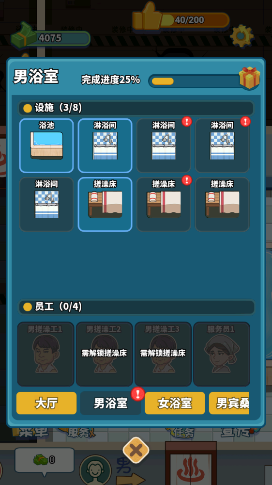 江南洗浴城(com.jiannanxiyu Cheng.anzhuo)是一款小型经营模拟游戏。玩家要经营一家洗浴中心,不断解锁更多的设施,扩大洗浴中心的规模。