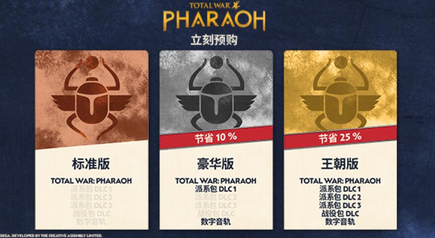 王朝版包括:全面战争:法老、派系包DLC 1、派系包DLC 2、派系包DLC 3、战役包DLC、数字原声带;