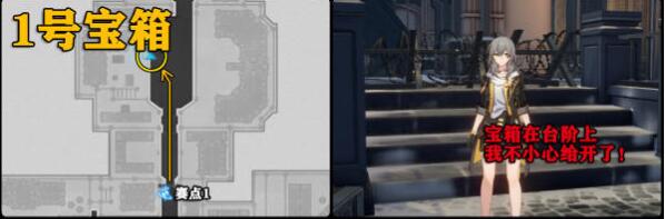 第一号宝箱:找到1号宝箱没有难度,玩家按照下图路线就可以在楼梯上看到宝箱;