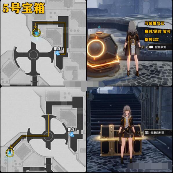 第五号宝箱:完成4号宝箱解密后,即可控制下图设备。您可以沿着下图的路线操作设备。顺时针和逆时针旋转两次即可过桥并获得宝箱。