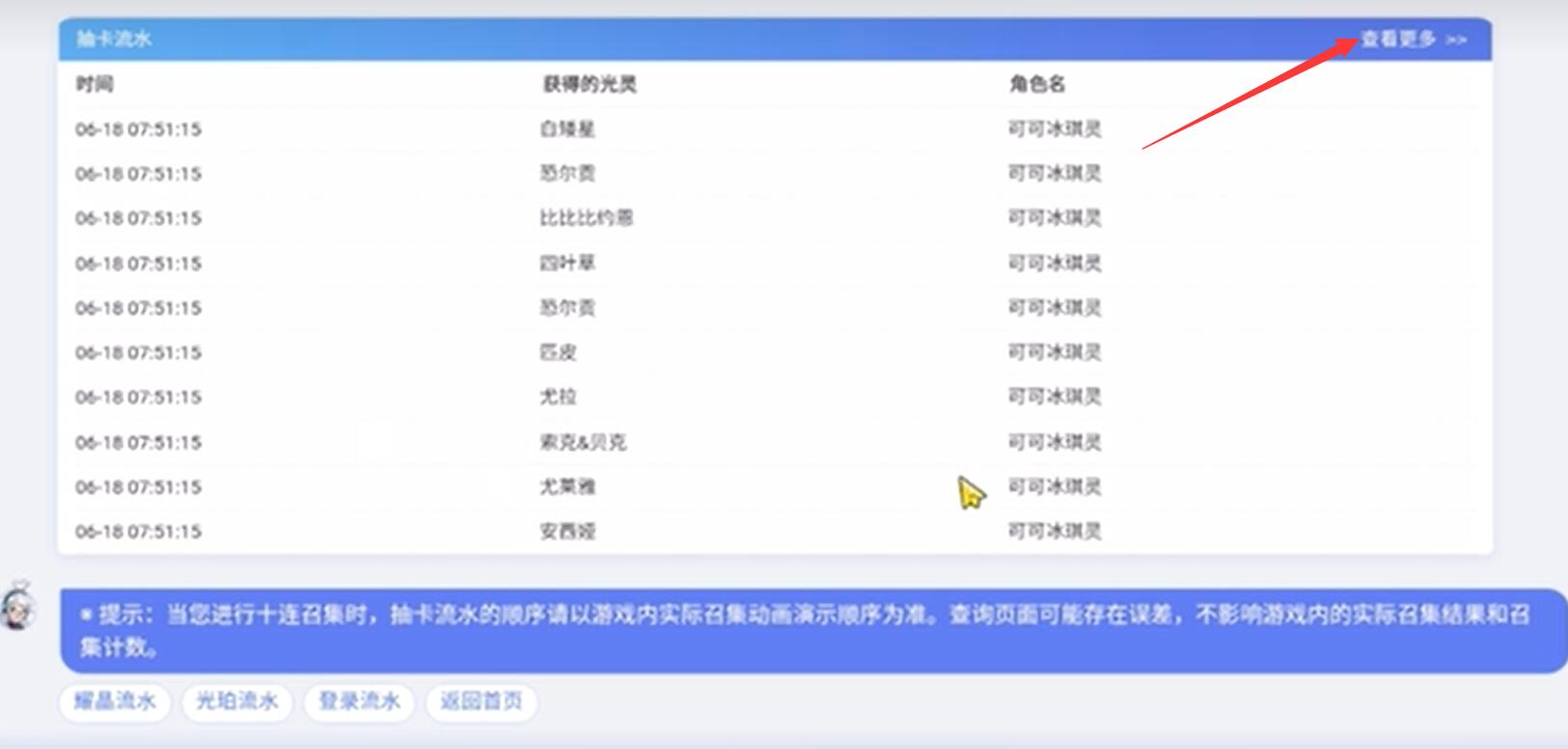 5、点击抽卡表右上角【查看更多】即可查看所有记录。