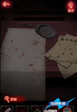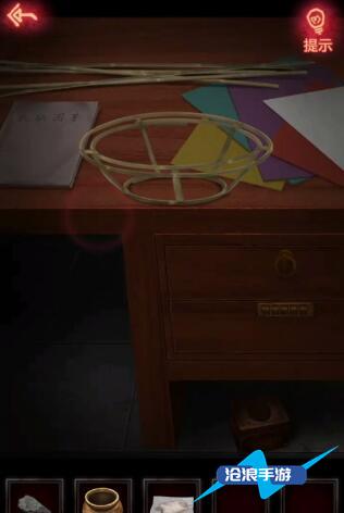 18.进入后点击地上的纸。这张纸就是门桌上书上的撕破页,还有阿姨怀里的皮影。这时按照之前的操作再进行一次粘贴,然后点击纸桌。使用之前的绘图点击竹子,然后使用粘贴点击竹子得到纸盆。