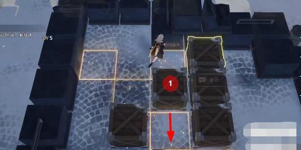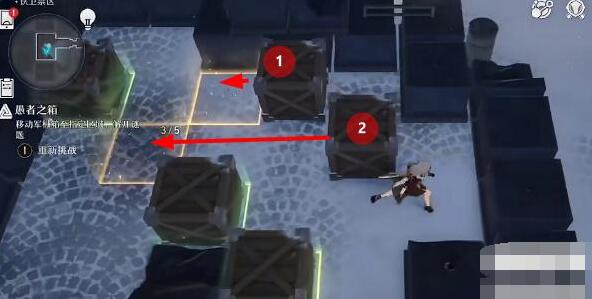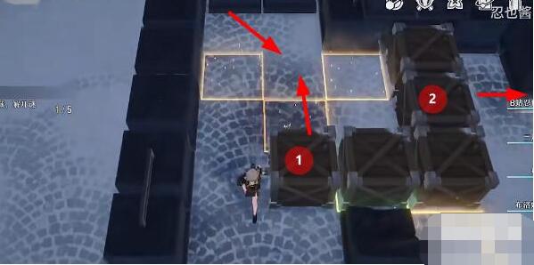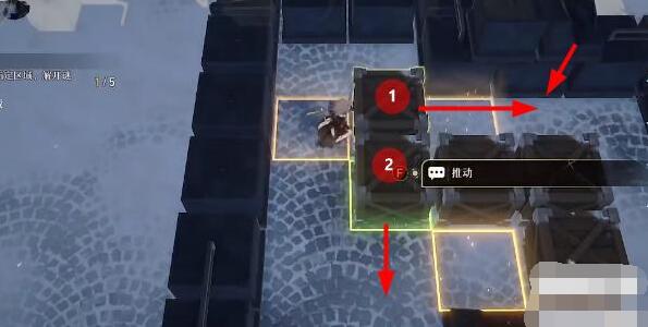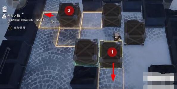1、首先我们进入推箱关卡后,将如图所示的1号箱向右推两格,将2号箱向下推一格。