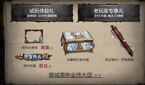 历史新低来了,商场新品大促销!一级好礼商城狂欢特卖40折,二级好礼是屠龙之力天王归来,三级好礼是热门新品限时折扣。不要错过!