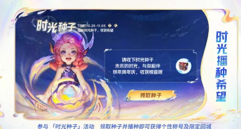 3、参加10.25-11.5时间种子活动,即可获得个性化称号和限时回城。九周年,收获种子即可解锁限定皮肤;
