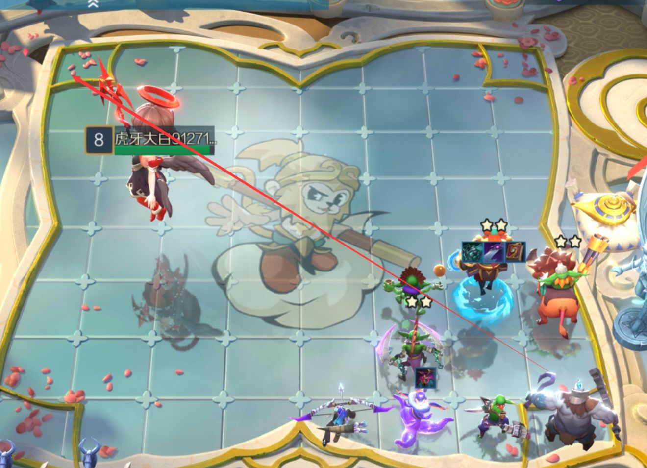 比如我们故意给对方跟踪者留一个空间让他来这个格子,这样他就可以被我们团打了。如果用饕餮的话,可以用钩子钩住对方的脆皮,然后一秒放火。