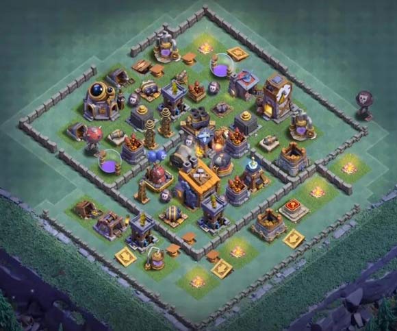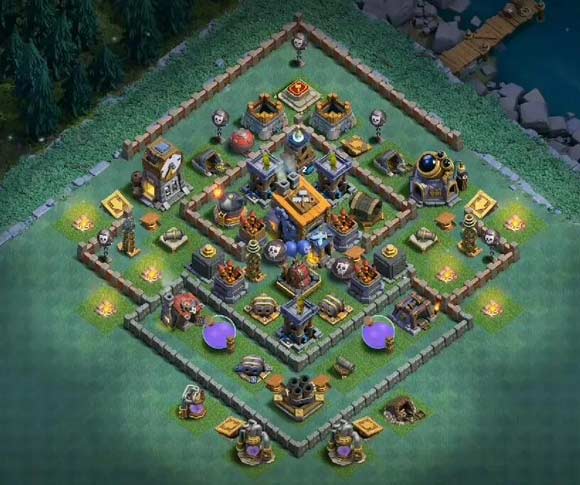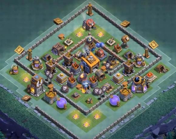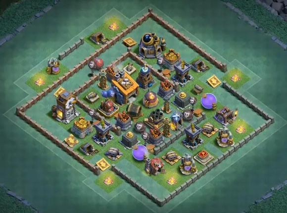 目前主建筑师基地比较流行的一种阵型,看起来很容易上手,但是阵型中间有交替开火的设施,基本可以克制平推的所有流派,但是使用的时候要保证巨人,多管,巨石处于高等级状态。