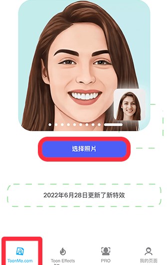 1、首先打开软件,切换到“ToonMe.com”选项卡,点击“选择照片”,从手机相册中选择一张想要将真人照片转成Q版漫画的照片。