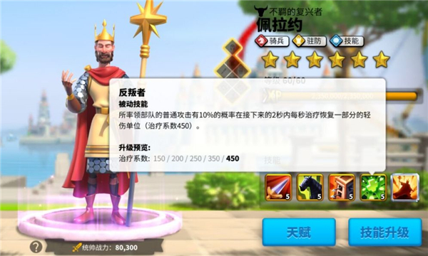 四技能,反叛者:该部队所率领的部队在接下来的2秒内,有10%的几率通过普通攻击每秒恢复一部分轻伤单位,治疗系数为450。