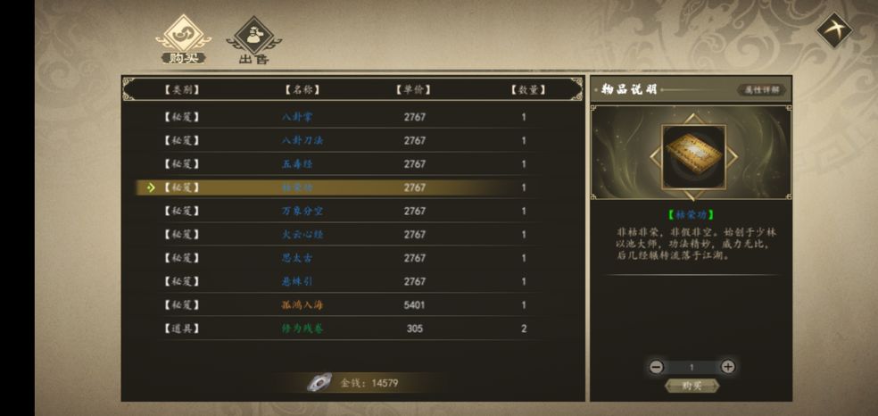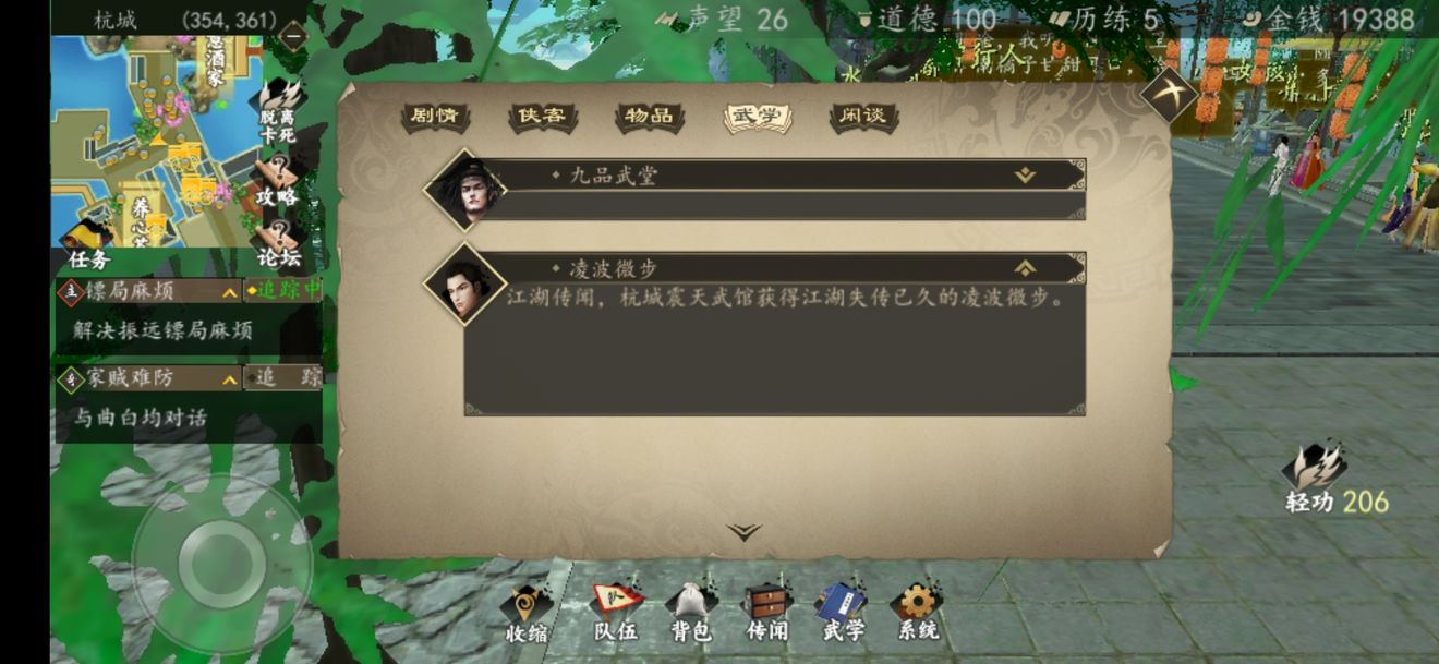 1。杭州田真武馆购买,武馆在桃花轩旁边,坐标(370,272) 。