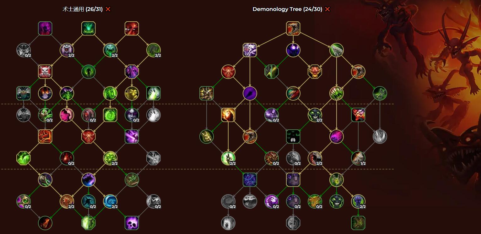 魔兽世界10.0前夕恶魔术天赋怎么加由于伊芙只有60级,所以普通天赋树只有26点天赋点,专业天赋树有25点天赋点。添加点如下图: