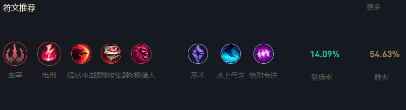 支配+触电+突然冲击+眼球收集器+终极猎手;魔法+水上行走+绝对专注(胜率:54.63%)