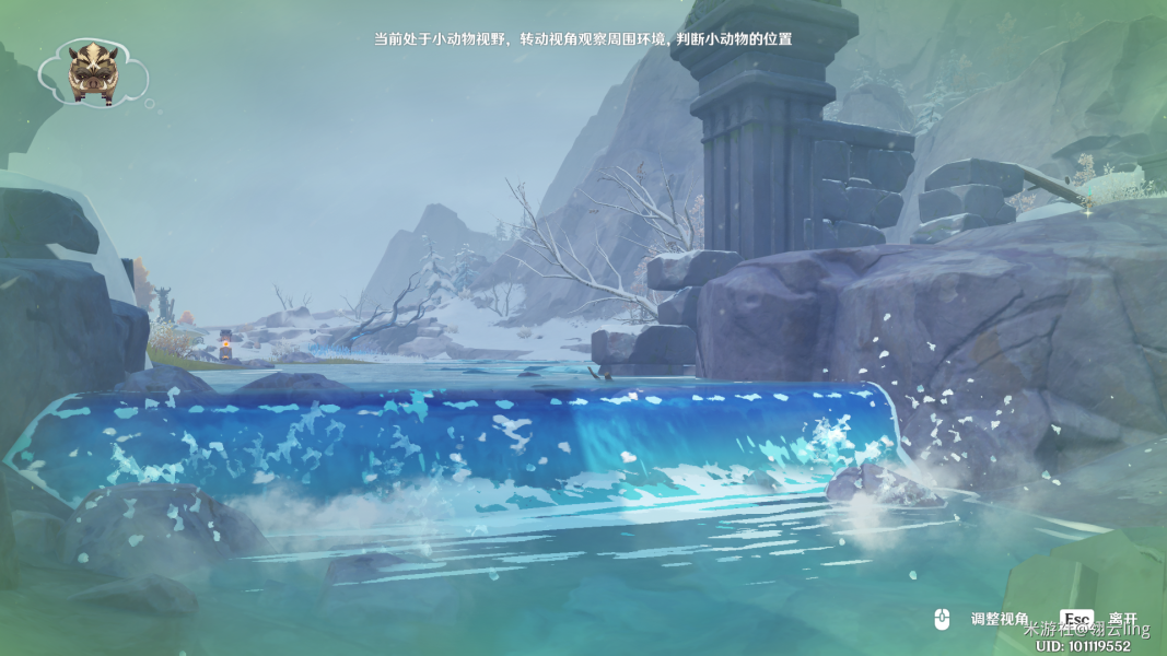 3.雪猪可以看到下游的河流,旁边有一根柱子。它的位置在右上角的河边;