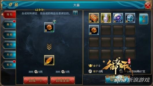 当你想要合成道具时,打开你的背包,你会发现一个“合成”按钮。你可以选择物品进行合成,也可以直接点击需要合成的道具。将出现两个选项:“合成”和“出售商店”。需要合成五件低级物品,合成成功率100%。合成仅需要少量的银结合。合成精石不消耗绑定银,但需要使用相应等级的合成器。如果合成材料中有绑定物品,则合成的物品也会被绑定,合成时会优先使用绑定的物品。