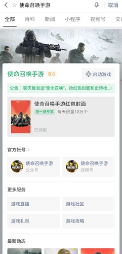 2.在搜一搜中进入使命召唤手游。页面第一项是红包封面上的活动地址。