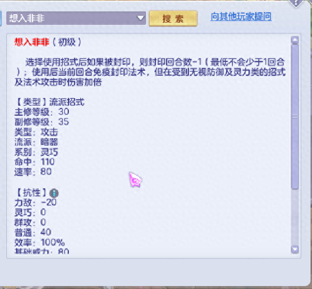 首先,招式技能分为低级、中级、高级。 100级之后,会有100级的动作。虽然大多数玩家都会优先考虑高等级的招式,但其实低等级的招式在实战中也发挥着很大的作用。同时招式中会出现四种抵抗:强敌、敏捷、普通、群攻。从耐性分类来看,普通型有中低端三种招式,分别是雾里看花、棉里藏针、七月流火。