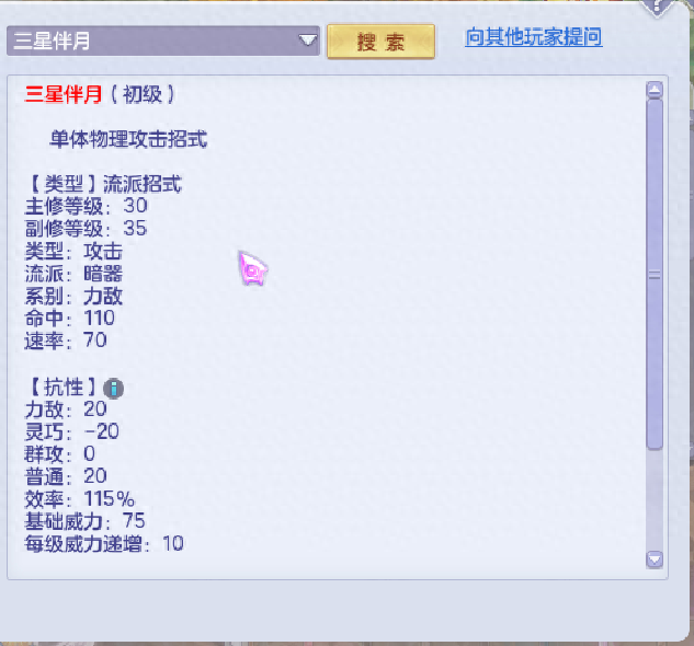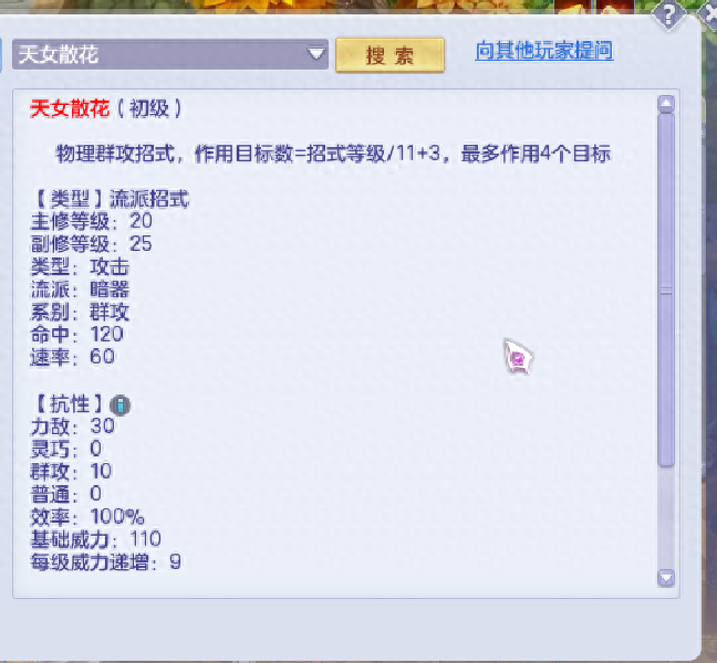 群攻系统中,招式是紫电穿云、天花散花。一般来说,天花板上平衡地散布鲜花效果更好。中级招式中可以选择投石、梅花三巷、钻石星。金刚星威力有200,是中级招式中最高的。你还可以选择另外两个毒招式,五毒断心,其他招式和技能将与你剩余的技能槽相匹配。