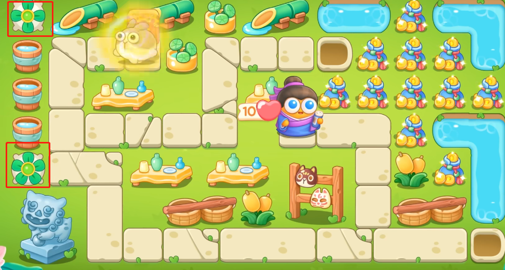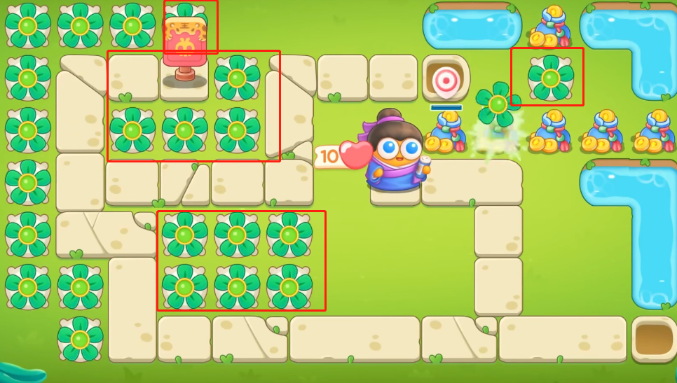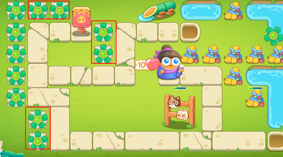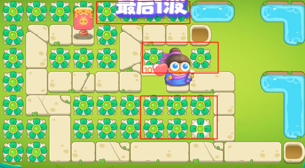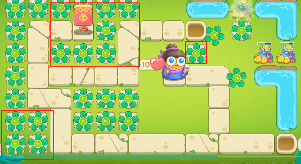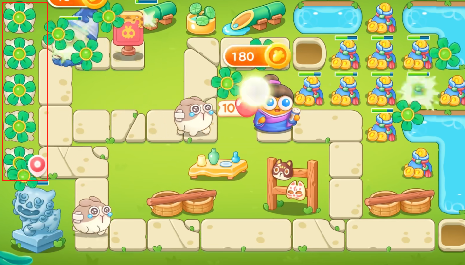 保卫萝卜4绿野奇缘第8关攻略1。进入游戏后,防范左侧两个位置的炮塔,如图。