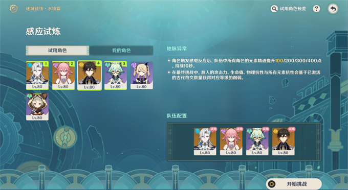 1.选择队伍角色【纳维莱特、八重神子、糖糖、钟离】。