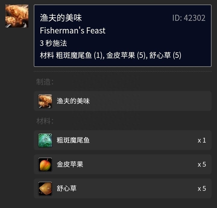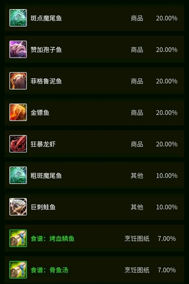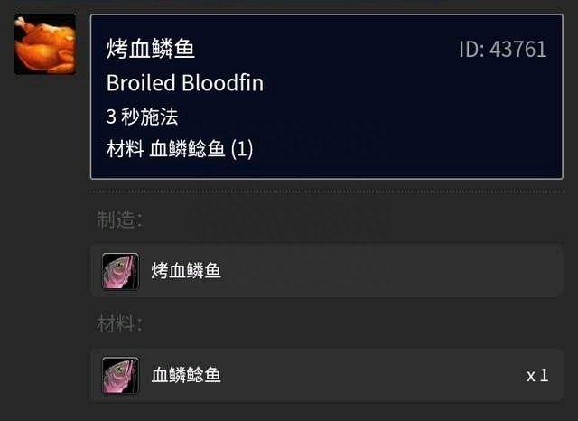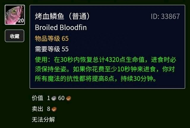 烤血鳞鱼,全抗,特定boss使用,沙塔斯贫民窟日常烹饪任务收集。