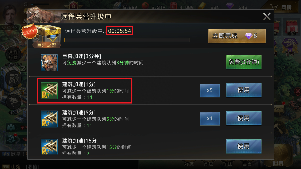 游戏中最大最容易的不是资源,而是“加速道具”,从1小时到1分钟都可以使用。前期研发、升级、招募的时间一般不超过1小时,但偶尔也会超过1小时。系统给出的道具足以应付,但后面会出现相反的情况。如果移动几个小时,只能选择氪加速或者立即使用“钻石”币。