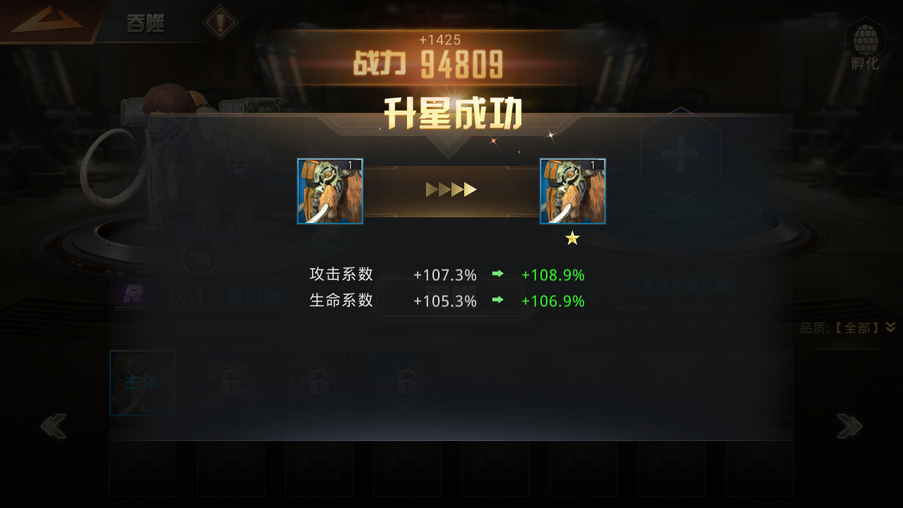升星模式为“吃人”,从0星升级到满星需要花费大量时间。好在有重置等级的功能,前期培养几个主力巨兽问题不大。至于什么样的庞然大物值得培养,就遵循“基础价值大于一切”的方向即可;