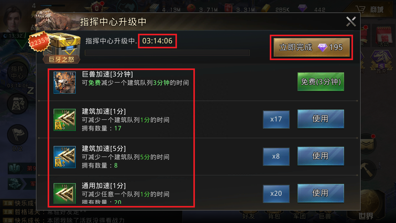 截图中,指挥中心升级耗时3小时14分钟。如果以下加速项不足,只能选择钻石加速,费用195。按照30元300钻石(不含额外赠品)计算,相当于升级19.5元,平均每次节省6元小时;