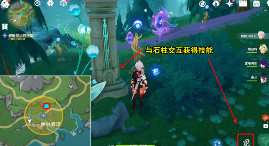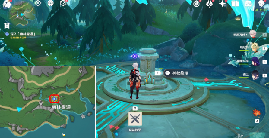 3、前往如下图位置,进入森林中的迷雾小路,与神秘祭坛互动;