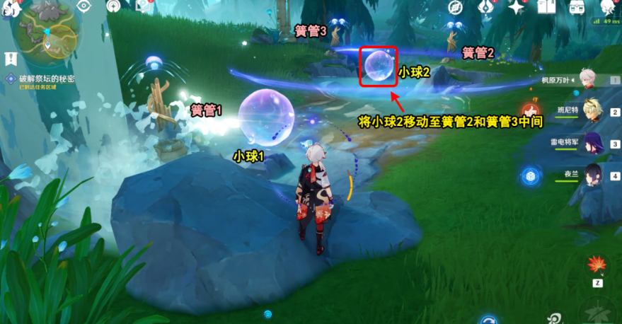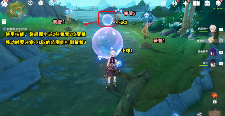 移动泡沫球使其能够同时到达三个簧管后,使用普通攻击击打泡沫球即可完成第一名。