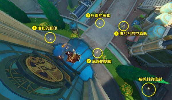 2.在现场找到五种线索:脚印、纽扣、酒瓶、划痕和信封。
