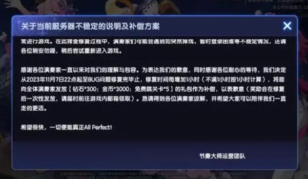 2023年11月7日《节奏大师》正式回归当天,服务器崩溃,玩家无法进入游戏。不过,很多玩家并不知道无法进入游戏的补偿方案是什么。官方为玩家准备了钻石、金币和免费跳级作为补偿。更多详细信息请参见这份薪酬计划概述,让我们来看看。