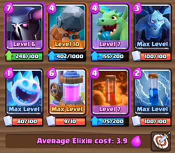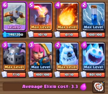 这也是一套非常不错的平民大卡。你可以使用大皮卡车与小飞龙一起前进,也可以使用大皮卡车先防守然后快速反击。毕竟这个版本时代有很多野猪骑士和石人套牌的使用者。大型皮卡车对于遏制野猪和石人非常有效。毒咒也是核心卡牌。它们不仅可以帮助皮卡车和野蛮人攻城锤快速清除骷髅和不死生物,而且它们的伤害也不容忽视!