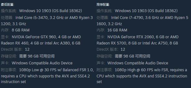 处理器:Intel Core i5-3470,3.2 GHz 或AMD Ryzen 3 1200,3.1 GHz
