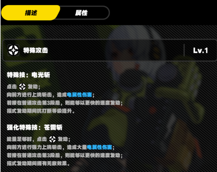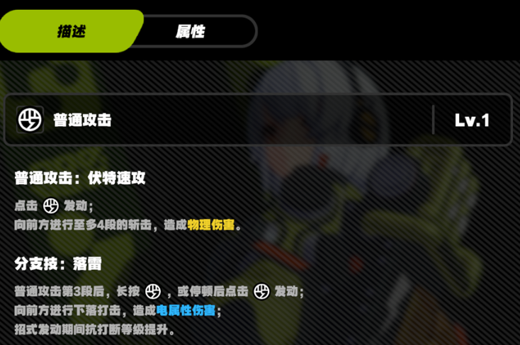 分支技能雷电是普通攻击第三阶段后向前施展坠落攻击,造成电击伤害。