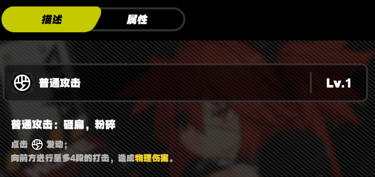 普攻,碾压碾压,再向前方四击,造成物理伤害;