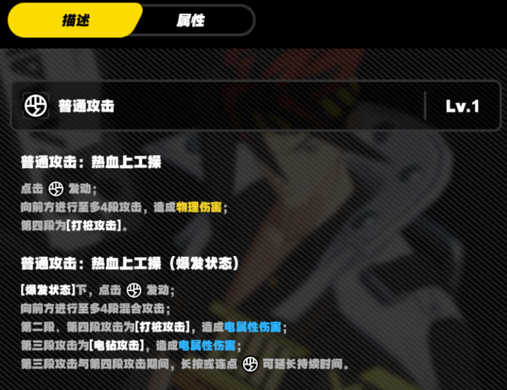 普通攻击爆发状态向前进行多阶段混合攻击效果,第二阶段和第四阶段造成电击伤害;
