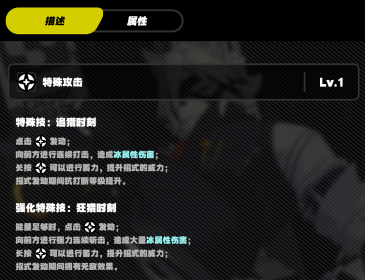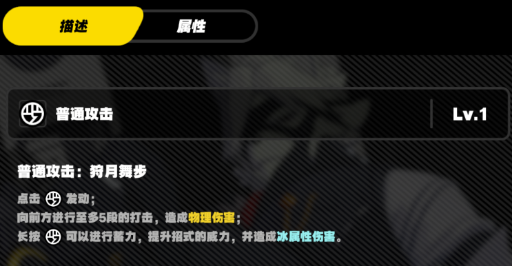 普通攻击是猎月舞,向前再进行五次攻击,造成物理伤害。招式威力增加,造成冰系伤害;