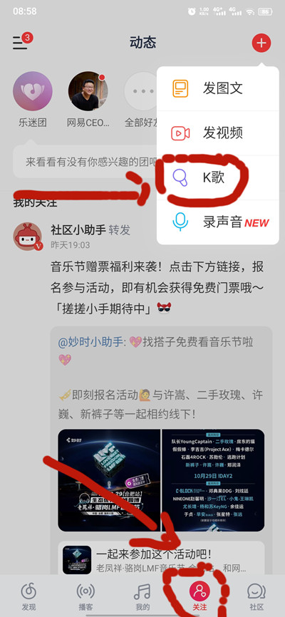 2、在动态页面中,我们点击右上角的“+”号,然后选择“K歌”;