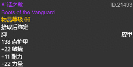 BIS装备“弓箭手之靴”,敏捷22点,体力11点,力量22点,既满足敏捷的需求,又保护了血量。力量也会增加攻击力,所以它是完美的装备。这件装备掉落的地方是安其拉废墟的拉贾克斯将军。没有竞争。基本上可以很便宜的带走。