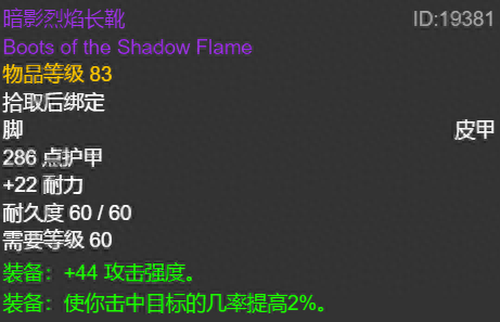 如果你脸黑就去BWL买“暗影火靴”。虽然22的白字不好,但是绿字的攻击强度有44,最重要的一点就是2%的命中,可以让莫德的伤害更加稳定。来源是BWL 的奈法利安。玩这个副本的组还是很多的,竞争也不是那么大。