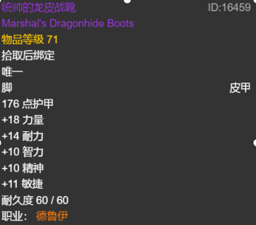 如果这还不行,那就去PVP战场用你的声望换取“将军/指挥官的龙皮靴”。属性以三维方式赋予,18力量、14耐力、10智力、11敏捷。毕竟没有哪双鞋能像其他鞋一样好用,所以追求一些立体属性才更实用。绿色角色还有16点法术伤害和治疗效果,还是很有用的。相比之前的伤害,其实并不算太大。毕竟18点力量还有36点攻击力加成。想要用好这个职业,最重要的是学好技术。装备再好也没关系!