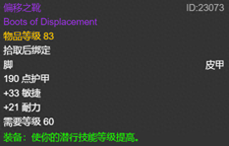 如果你是脸色黝黑的程人,那就只能把目光放在“流浪靴”上了。 33点敏捷直接满足属性要求,21点耐力也保证了生命值。绿色属性是为了提高你的隐身技能等级,但是在群体中并不是特别实用。来源是NAXX的Reaper Gotik和其他一些精英怪物。 33点敏捷还是很不错的。我个人的测量表明,损坏程度并不比第一双鞋差多少。