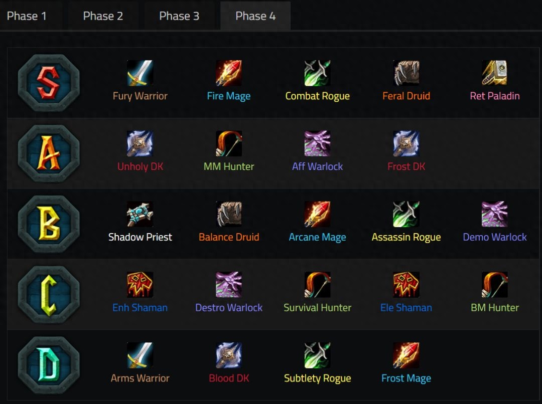 T1级别中,从P1到P4共有三个更强的职业,分别是邪恶DK、痛苦和冰冻DK。虽然最终没有达到T0级别,但是在输出专精方面还是相当强的。另一位射击猎人也是利用破甲和装备等级提升从下往上爬,然后离开同伴生存狩猎两级。