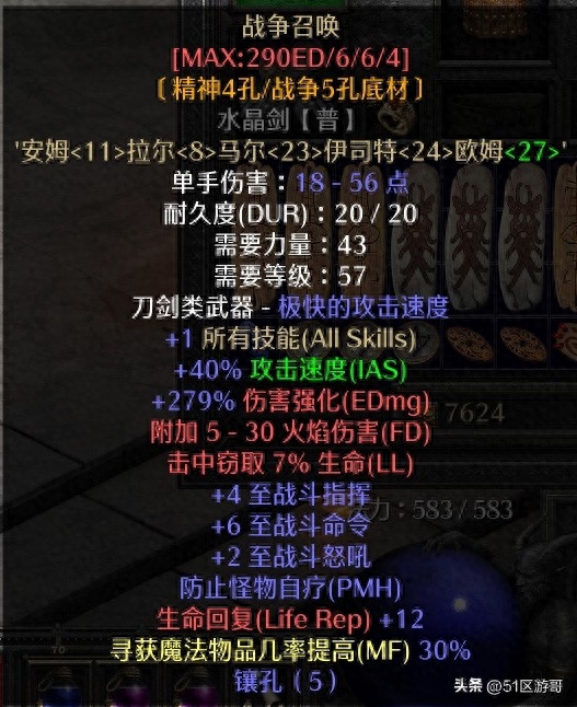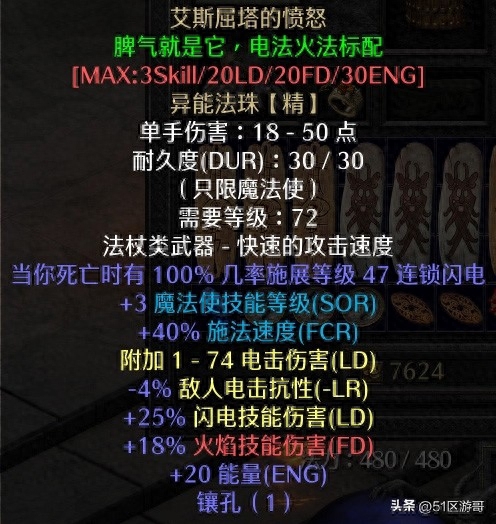 1.武器:艾丝黛拉的脾气,所有技能加3和40%快速施法,最大20%雷电伤害和20%火焰伤害,最大能量30点。另外,我们可以打一个孔,嵌入一个55的电球。