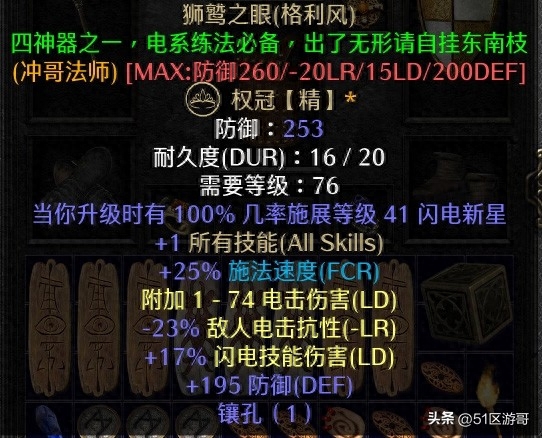 2.头盔:狮鹫之眼,所有技能加1,快速施法增加25%,降低敌人20%电击抗性,15%闪电伤害。头盔还可钻孔镶嵌55颗电球。