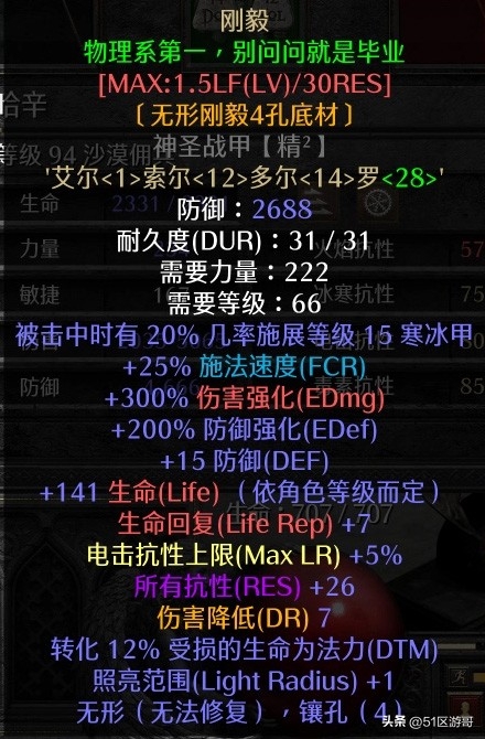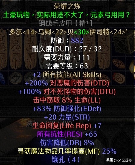 4.护甲:荣耀的考验(可以选择神秘),所有技能加2,力量加20,总抗性65,可以提供满抗。