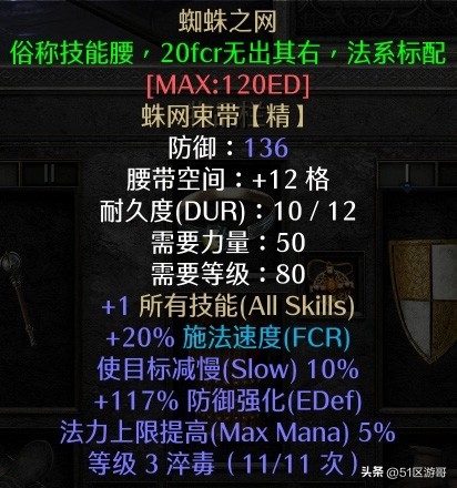 7.腰带:蜘蛛网,所有技能加1,施法速度增加20%,同时提供5%法力上限。
