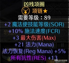 项链:增加2点法师技能和10%施法,并增加13点总抗性和法力恢复。