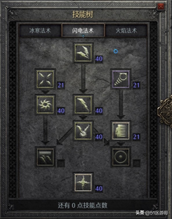 1.电类技能:带电炸弹、闪电箭、闪电链、闪电新星、闪电专精,1点瞬移,1点瞬移,1点静电场。