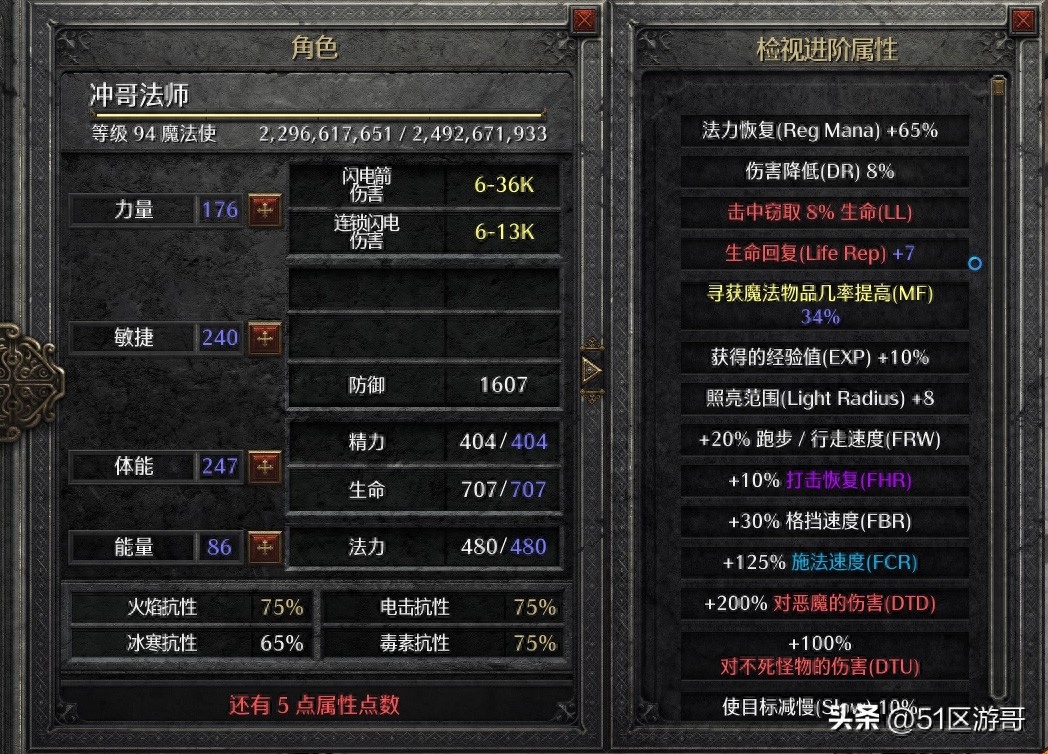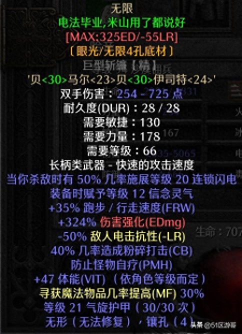 在此配置下,在五个55电球和装备的支持下,雷电伤害额外增加60%,敌人电阻额外降低45%。可见,降低抗性和增加伤害都是好的(51区葛优原创)。
